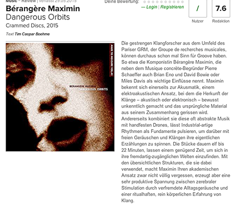 "I've heard that Ridley Scott is planning a sequel to his legendary science-fiction thriller 'Blade Runner'. Here is the soundtrack of it !… While electronic bands such as Autechre or Aphex Twin make profit from the superficiality of the machinery, Bérangère Maximin gives the impression she deeply understands and implements poetry and moods into the process…. Addictive."