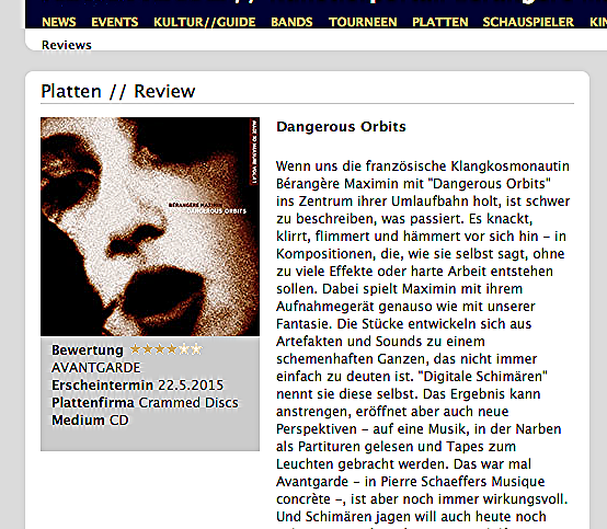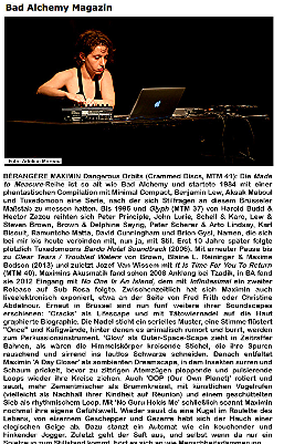 (…) L'électroacousticienne Bérangère Maximin mêle trames et boucles de sons fixés à d'autres, produits dans l'instant, avec une part d'improvisation. Sa musique est un pont entre l'école acousmatique française qui se souvient de l'héritage de Pierre Schaeffer, et les récents développements des musiques électrons, qui ne disent pas non à la pulsation. Elle navigue entre les deux mondes sans arrêt et avec une grande aisance, nous entraînant à sa suite dans des paysages inconnus. Michel Chion demandait un jour "la musique du futur a-t-elle un avenir ?". Certainement répondra-t-on, et il est quelque-part par là.